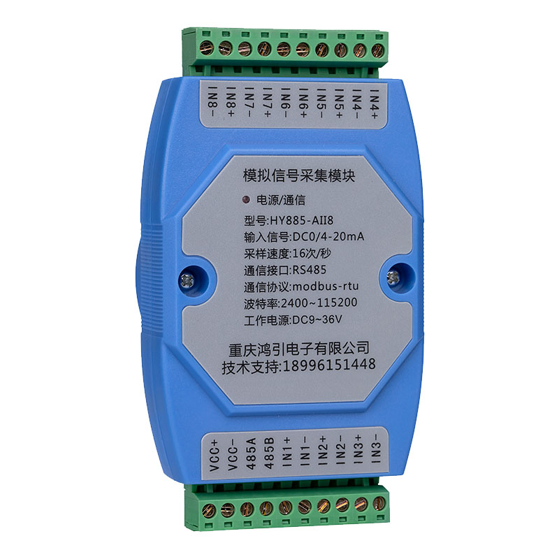 采用進(jìn)口16位模數(shù)轉(zhuǎn)換芯片,把8路DC0~20mA模擬信號(hào)轉(zhuǎn)換成數(shù)字信號(hào),通過RS485接口輸出,DC0~20mA輸入對(duì)應(yīng)的數(shù)字量為0-20000,最高可測(cè)到DC24mA。DC0~20mA模擬信號(hào)輸入與工作電源、RS485之間隔離。RS485通信采用標(biāo)準(zhǔn)Modbus-rtu協(xié)議,可與各種組態(tài)軟件、PLC、觸摸屏聯(lián)網(wǎng)。出廠預(yù)設(shè)RS485通信參數(shù):模塊地址1,波特率9600,8個(gè)數(shù)據(jù)位,無校驗(yàn)位,1位停止位,用戶通過上位機(jī)參數(shù)設(shè)置軟件修改通信參數(shù)。