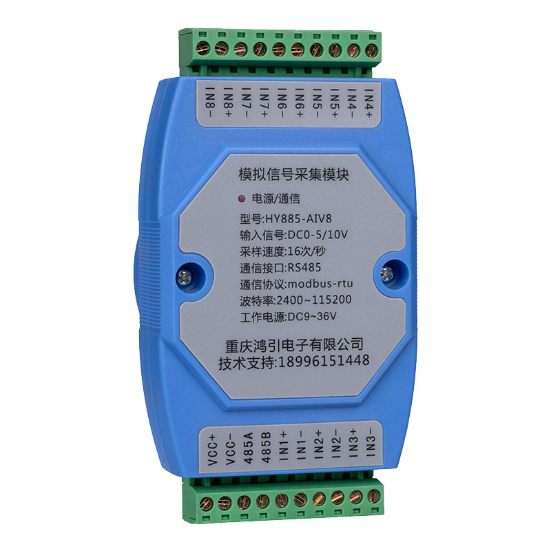 采用進(jìn)口16位模數(shù)轉(zhuǎn)換芯片,把8路DC0~5V(或10V)模擬信號轉(zhuǎn)換成數(shù)字信號,通過RS485接口輸出,DC0~5V(或10V)輸入對應(yīng)的數(shù)字量為0-20000。DC0-5V(或10V)模擬信號輸入與工作電源、RS485之間隔離。RS485采用標(biāo)準(zhǔn)Modbus-rtu協(xié)議,可與各種組態(tài)軟件、PLC、觸摸屏聯(lián)網(wǎng)。出廠預(yù)設(shè)RS485通信參數(shù):模塊地址1,波特率9600,8個數(shù)據(jù)位,無校驗位,1位停止位,用戶通過上位機(jī)參數(shù)設(shè)置軟件修改通信參數(shù)。