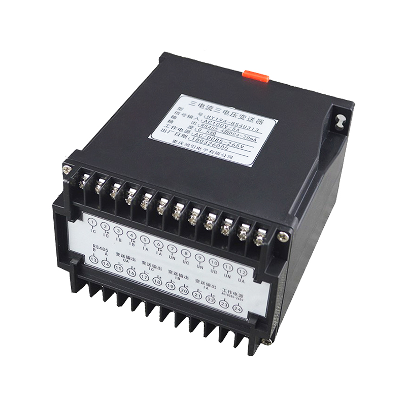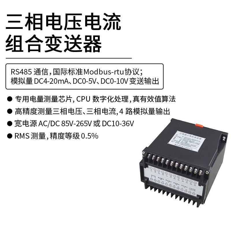 三相電壓電流組合變送器,通過(guò)專用電量芯片采樣,CPU 數(shù)字化處理,真有效值算法,高精度的測(cè)量三相電壓,三相電流,隔離轉(zhuǎn)換成線性直流標(biāo)準(zhǔn)模擬信號(hào)輸出或RS485數(shù)字通信接口輸出。模擬量可選:DC0~20mA、DC4~20mA、DC0~5V、DC1~5V、DC0~10V等變送輸出;RS485數(shù)字通信接口,采用國(guó)際標(biāo)準(zhǔn)Modbus-rtu通信協(xié)議,可與各種PLC、HMI、組態(tài)軟件實(shí)現(xiàn)組網(wǎng)。