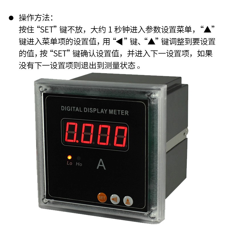 按住“SET”鍵不放,大約1秒鐘進(jìn)入?yún)?shù)設(shè)置菜單,“▲”鍵進(jìn)入菜單項的設(shè)置值,用“?”鍵、“▲”鍵調(diào)整到要設(shè)置的值,按“SET”鍵確認(rèn)設(shè)置值,并進(jìn)入下一設(shè)置項,如果沒有下一設(shè)置項則退出到測量狀態(tài)。