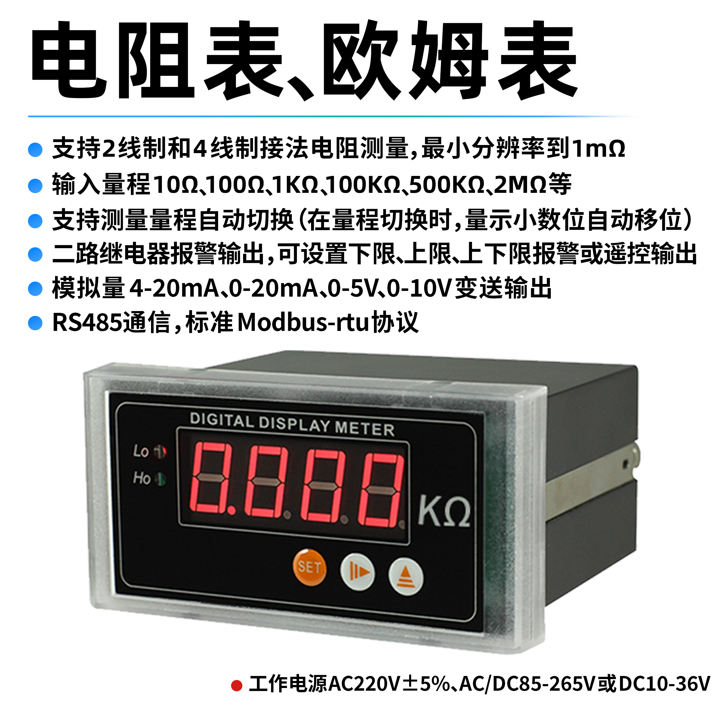 舉例:電阻表,帶2路繼電器報(bào)警輸出,RS485通信,工作電源DC10~36V,型號為:HY655R-S1-R-A2-P3。