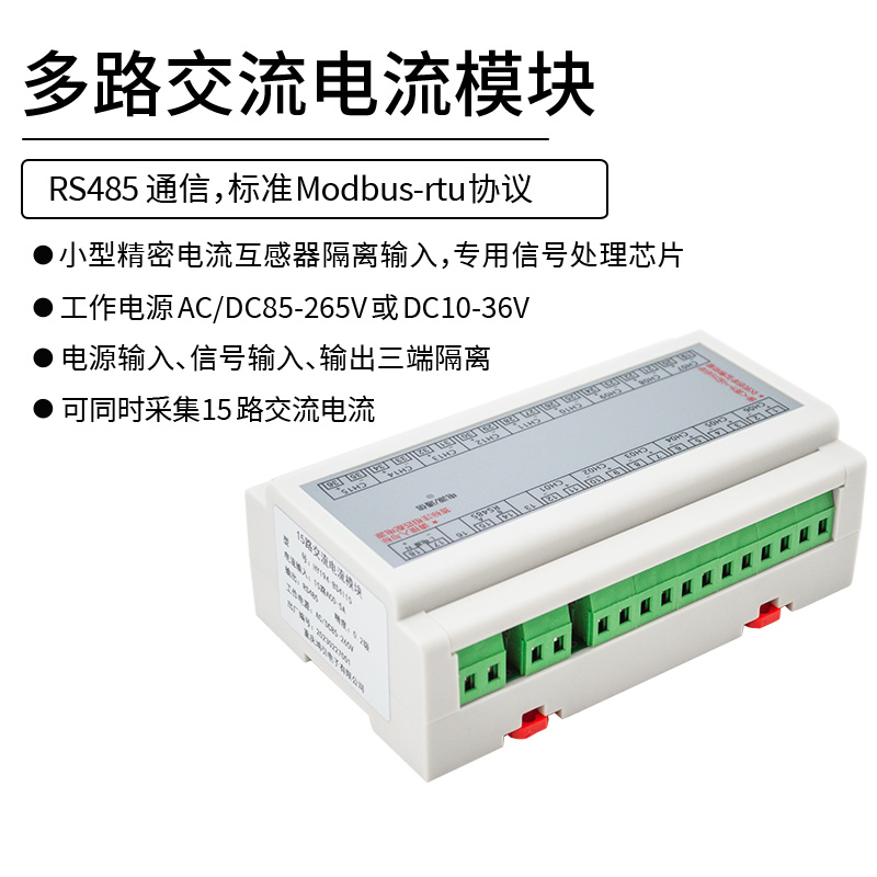 多路交流電流采集模塊,最多可同時采集15路交流電流,采集速度達到13.3次/秒。高精度測量交流電流,精度達0.2級。RS485數(shù)字通信接口,采用國際標準Modbus-rtu通訊協(xié)議,可與各種PLC、HMI、組態(tài)軟件實現(xiàn)組網(wǎng)。
